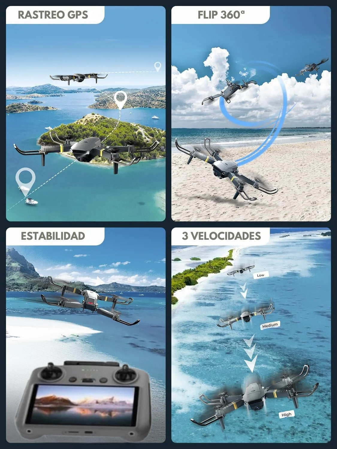 📸 Sí, cuenta con cámara HD (o 4K, según el modelo) y sistema de estabilización electrónica que garantiza tomas nítidas y sin vibraciones, ideales para fotos y vídeos profesionales.